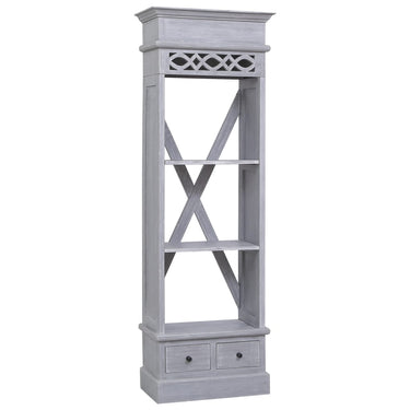 De massief houten boekenkast is gemaakt van massief mahoniehout met een greywash afwerking en is buitengewoon duurzaam en stevig. Mahonie is een tropisch hardhout dat opvalt door zijn schoonheid, duurzaamheid en kleur. Deze kast heeft 3 open vakken en 2 lades die voldoende ruimte bieden voor het opbergen van boeken en decoratieve spullen.