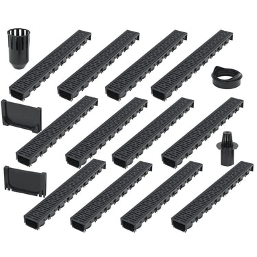 Deze complete set bestaat uit 12 afvoerkanalen met kunststof roosters, 1 filtersysteem, 1 bodemafvoeraansluiting en 2 einddoppen. Hij is een perfecte oplossing voor het verzamelen en afvoeren van overtollig water van opritten, patio's en andere buitenruimtes.