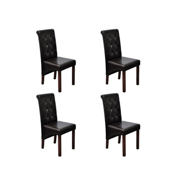 Deze set van 4 comfortabele en grote eetkamerstoelen heeft een antiek design en de stoelen hebben ergonomisch gevormde zittingen en rugleuningen. De poten zijn gemaakt van massief hout en zijn vernist met een donkerbruine kleur. Voor de veiligheid zijn de hoeken afgerond. De stoelen zijn eenvoudig te onderhouden en schoon te maken. De zittingen en rugleuningen van deze stoelen zijn bekleed met duurzaam synthetisch leer.