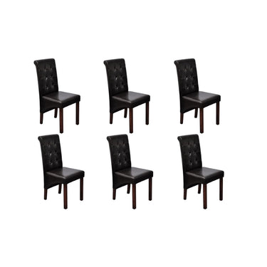 Deze set van 6 comfortabele en grote eetkamerstoelen heeft een antiek design en de stoelen hebben ergonomisch gevormde zittingen en rugleuningen. De poten zijn gemaakt van massief hout en zijn vernist met een donkerbruine kleur. Voor de veiligheid zijn de hoeken afgerond. De stoelen zijn eenvoudig te onderhouden en schoon te maken. De zittingen en rugleuningen van deze stoelen zijn bekleed met duurzaam synthetisch leer.